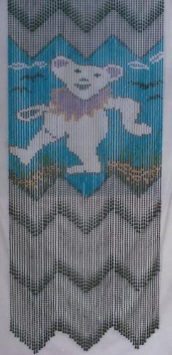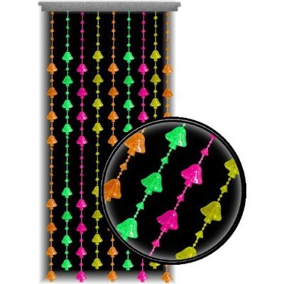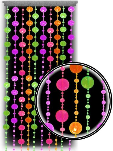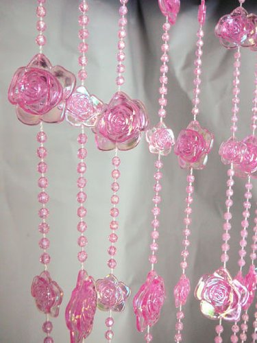 - Pink iridescent colored curtain with round beads embellished with pink roses.